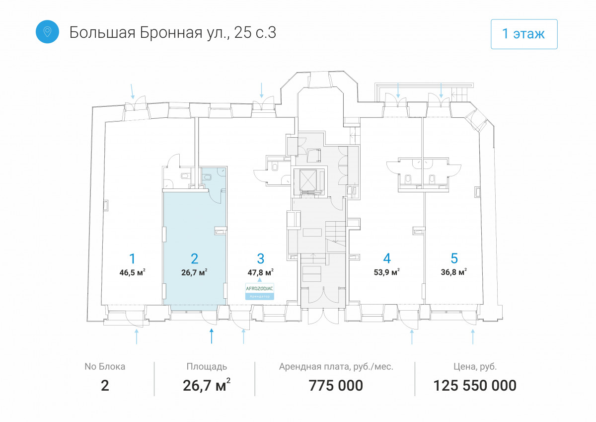Аренда Street Retail помещений торгового или свободного назначения (ПСН) площадью от 26,7 до 53,9 кв.м на 1 этаже нежилого здания. Планировка — свободная, перекрытия — ж/б, высота потолков — 4,3 м. Отлично подойдёт в аренду под любой вид деятельности: кафе, торговое помещение, магазин, кофе, аптека, цветы, медицинский кабинет, шоу-рум, табак и др.